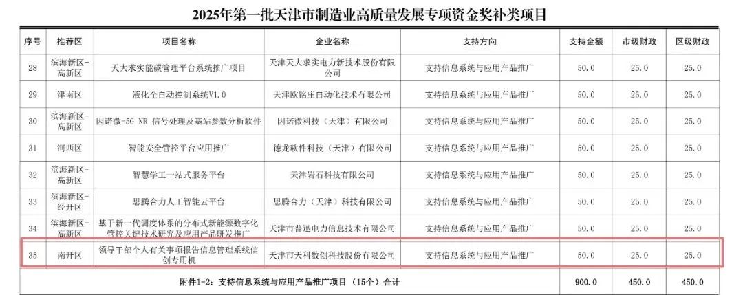近日,天津市天科数创科技股份有限公司(以下简称“公司”)研发的“领导干部个人有关事项报告信息管理系统信创专用机”成功入选2025年第一批天津市制造业高质量发展专项资金奖补类项目。